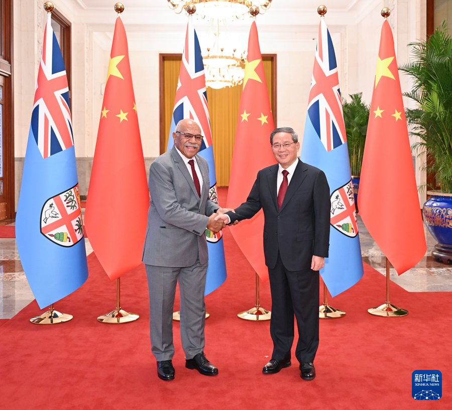 ??李強指出,中方愿同斐方一道努力,推動兩國務實合作提升到新的水平。雙方要進一步發揮互補優勢,在高質量共建“一帶一路”框架下深化基礎設施、農漁業、輕工業、教育、旅游、減貧等領域合作,更好促進共同發展。中方愿進口斐方更多優質產品,支持中資企業到斐濟投資興業。中斐同為“全球南方”成員,中方贊賞斐方提出的“和平之?!痹妇埃С痔窖髰u國落實《藍色太平洋2050戰略》,愿加強同斐濟等島國的溝通協作,積極落實全球發展倡議、全球安全倡議、全球文明倡議,共同倡導平等有序的世界多極化和普惠包容的經濟全球化。