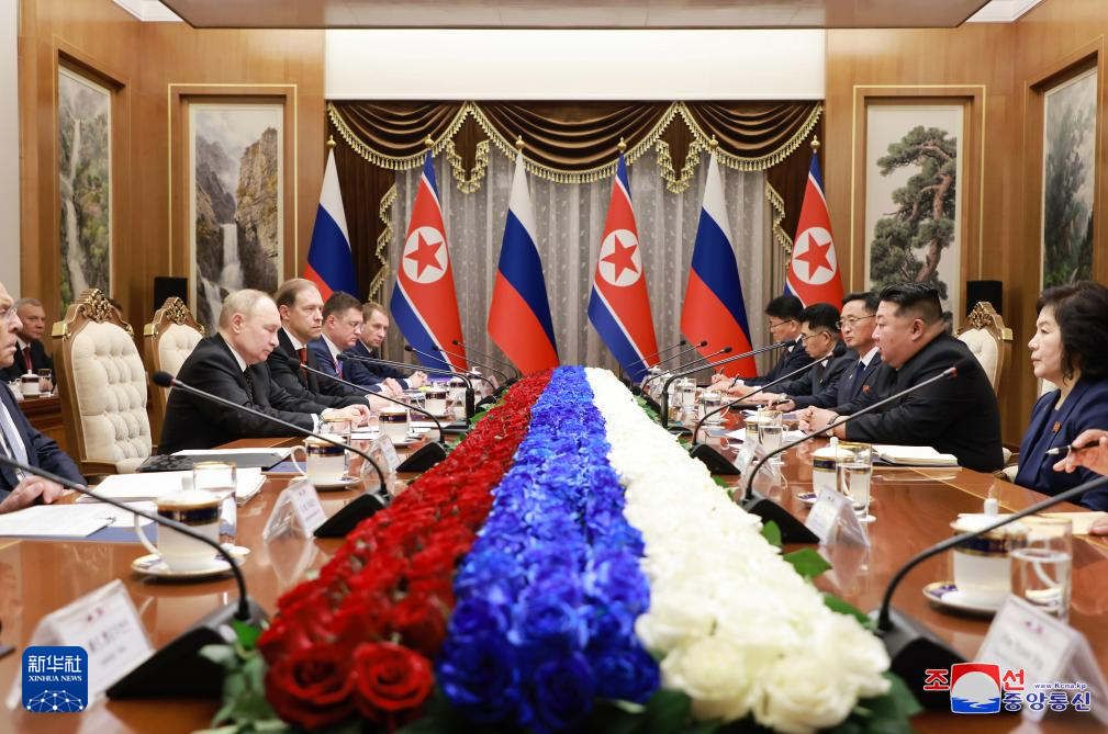6月19日,在朝鮮平壤,朝鮮勞動黨總書記、國務委員長金正恩與俄羅斯總統普京舉行會談。